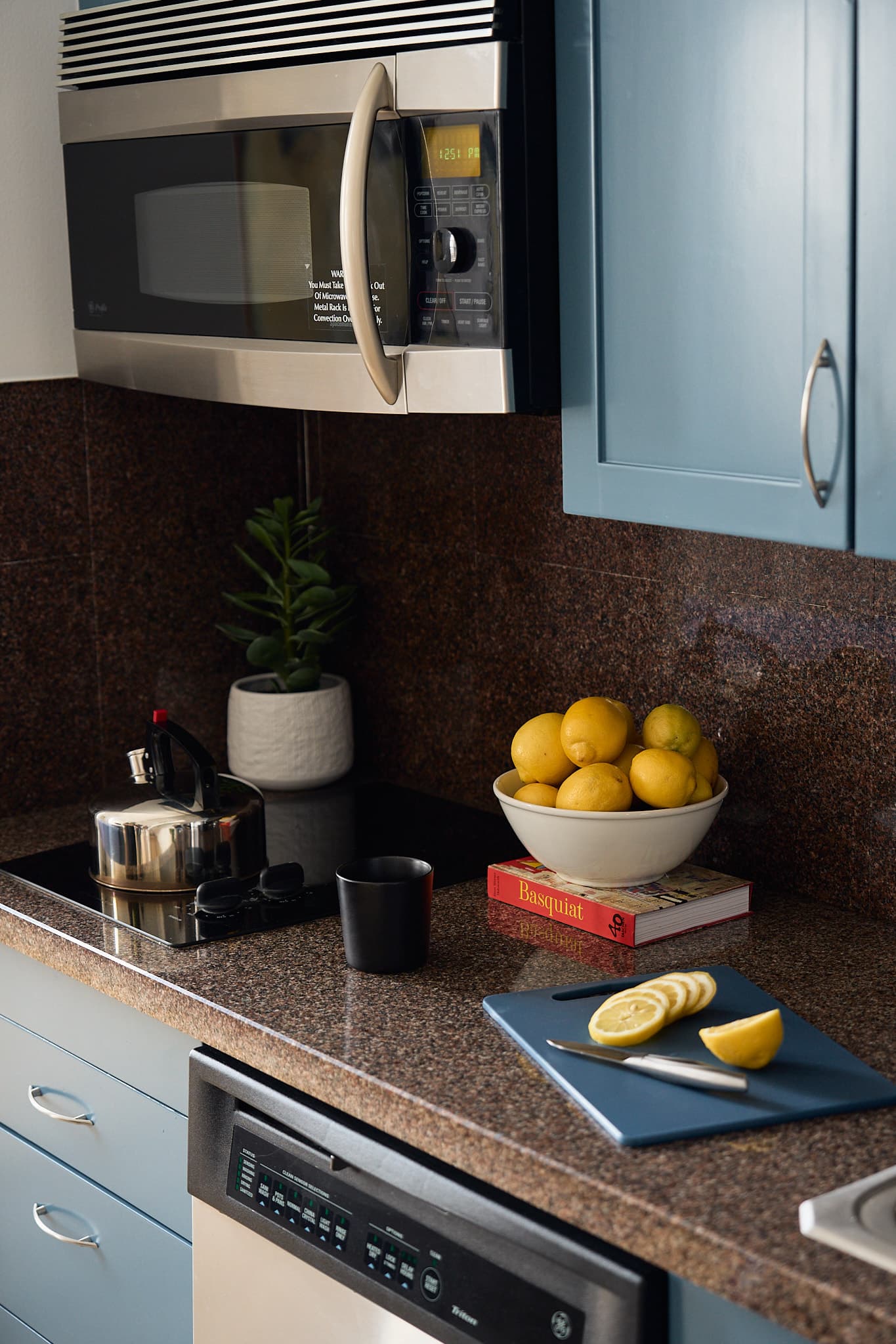 Our Houston two-bedroom loft apartment boasts a full kitchen, upscale linens and toiletries, and in-room conveniences like a hair dryer, iron and ironing board. In addition, you'll find modern conveniences like yoga mats, smart TVs, room service and weekly housekeeping.